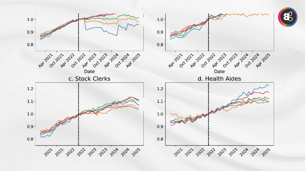 Interestingly, this effect isn’t uniform. Hands on professions like health aides, maintenance workers, and taxi drivers have seen employment remain steady or even grow. It’s a stark reminder: AI’s impact depends on the type of work and how it’s deployed.