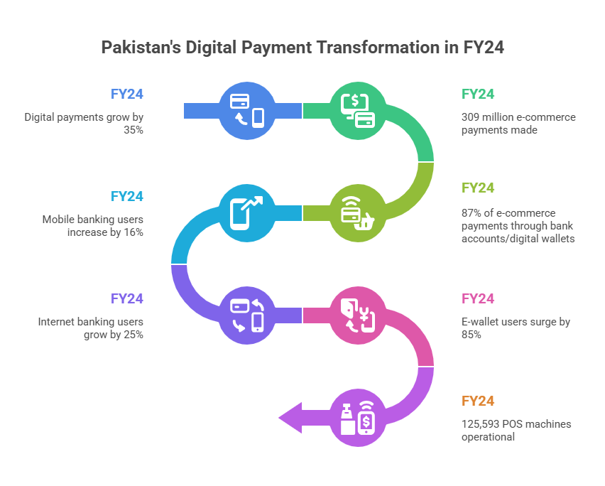 The State Bank of Pakistan reported that 309 million e-commerce payments were made during FY24, with a total transaction value of PKR 406 billion. Significantly, 87% of e-commerce payments were initiated through bank accounts or digital wallets, indicating a gradual shift away from cash-based transactions.