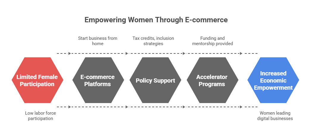 The e-commerce sector is creating new opportunities for women entrepreneurs, despite broader participation challenges. Only 23% of women participate in Pakistan’s labor force, but e-commerce platforms enable women to start businesses from home, overcoming traditional mobility and cultural constraints.