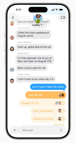 In group chats, you can now create polls to plan events or vote on things, and Apple Intelligence will suggest starting polls when helpful. Group chats also get custom backgrounds, typing indicators, and support for Apple Cash transfers. Messages from unknown numbers will go to a separate folder, where you can choose to accept, block, or delete them. Live Translation in texts will translate your messages as you type and translate incoming messages automatically.
