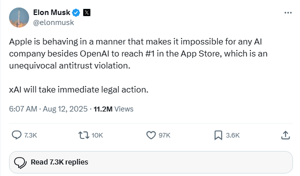 In a series of posts on X (formerly Twitter), the platform he owns, Musk alleged that Apple has structured its App Store in a way that makes it “impossible for any AI company besides OpenAI to reach #1.” He announced that his company would take “immediate legal action” to challenge what he calls unfair and anti-competitive practices.