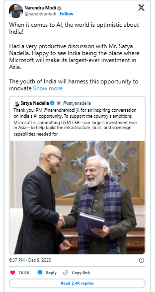 “Microsoft has been part of India’s fabric for more than three decades,” said Puneet Chandok, president of Microsoft India and South Asia. “As the nation moves confidently into its AI-first future, we are proud to stand as a trusted partner in advancing the infrastructure, innovation, and opportunity that can power a billion dreams.”
